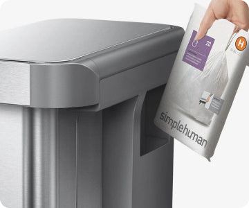 Rangez les sacs dans le compartiment, saisissez en un nouveau directement depuis l'intérieur de la poubelle, puis rabattez la bordure pour dissimuler le sac et le maintenir en place.