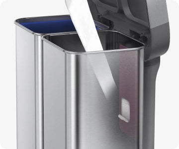 Avec notre option à double compartiment, le tri des déchets a fière allure ! Chaque côté est doté d'une grande capacité, tandis que le bac de recyclage amovible et la réserve à sacs située dans le compartiment pour déchets ménagers permettent de vider facilement la poubelle.