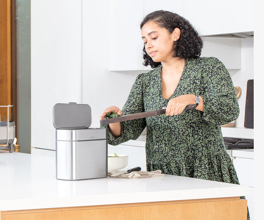 Le bac à compost se détache facilement de sa station d'accueil magnétique et peut être posé sur le plan de travail pendant et après la préparation des repas.