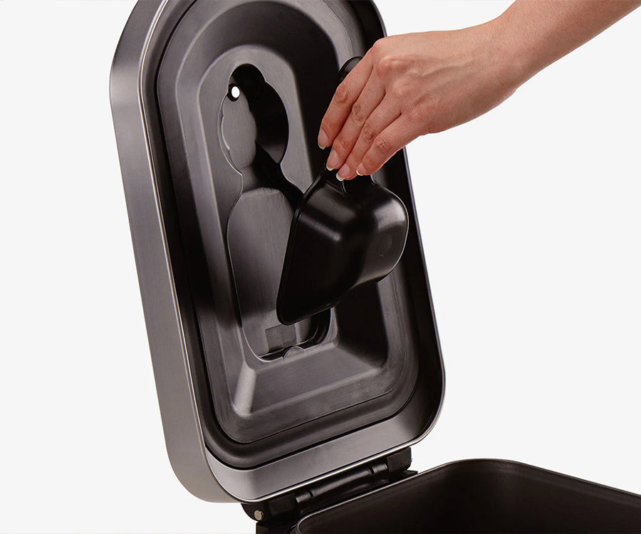 Cette dosette magnétique se fixe sous le couvercle avec un aimant, vous évitant ainsi de fouiller dans le bac à l'heure du repas.