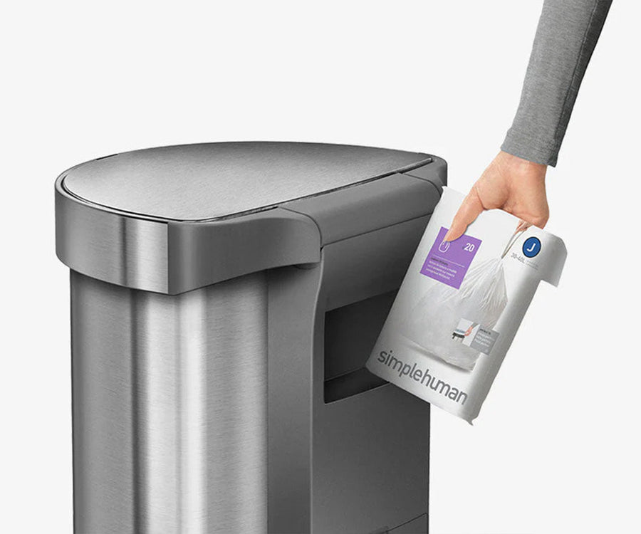 Grâce à notre réserve à sacs, vous pouvez stocker une recharge de 20 sacs sur mesure à l'intérieur de la poubelle. Plus besoin de les chercher.